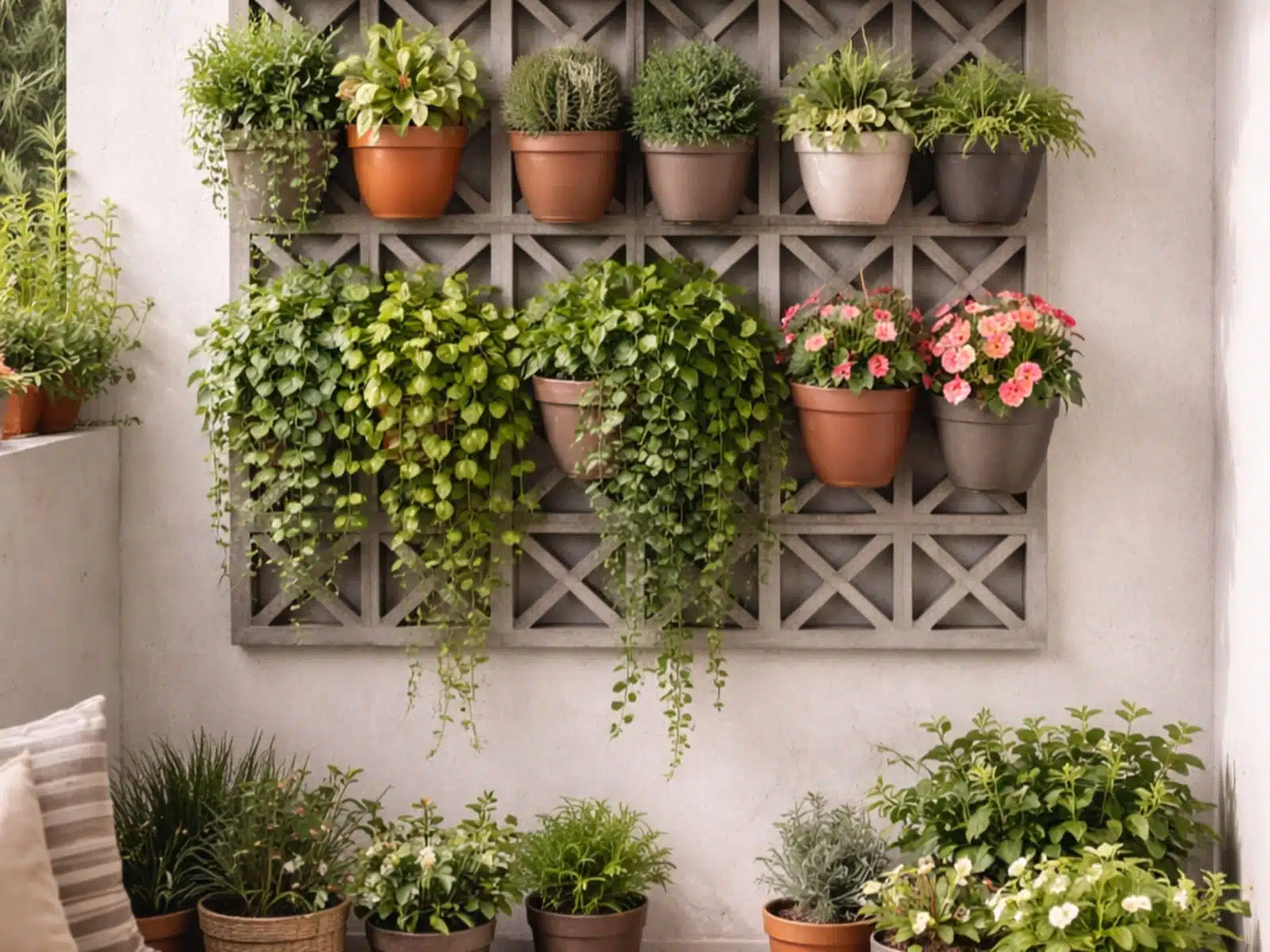 La celosía es el esqueleto de tu jardín. Puedes optar por celosías de hormigón para un look moderno, robusto y duradero, o por celosías cerámicas si buscas un toque más rústico o mediterráneo. Asegúrate de que sea lo suficientemente resistente para soportar el peso de las macetas, la tierra húmeda y las plantas adultas. Mide bien el espacio y elige un diseño que complemente la estética de tu hogar.